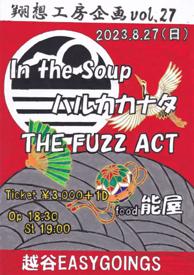 ********************************** 翔想公房さんのイベントに出演します! 2023年08月27日[日] 「翔想公房企画 vol.27」 会 場: 埼玉 越谷 EASYGOINGS [HOME] 料 金: 3,000円 (D別) 時 間: Open 18:30 / Start 19:00 チケット:ライブハウスEASYGOINGSのチケット予約フォームをご利用ください バンド予約は inthesoup.nakao@gmail.com までメールを送ってください 出 演:In the Soup, ハルカカナタ, The Fuzz Act 問い合せ:EASYGOINGS 048-963-1221(受付時間14:00〜22:00) ![]() ********************************** 2023年10月06日[金] 「In the Soup ワンマンLIVE ジュテーム2023 〜3年かくれんぼ〜」 会 場: 東京 下北沢 Shelter [HOME] 料 金: 前売 4,500円 (D別) / 当日 5.000円 (D別) 時 間: Open 19:00 / Start 19:30 チケット:e+ にて発売中 問い合せ:下北沢シェルター 03-3466-7430 ![]() ※ → Schedule 8月13日のライブの配信情報!2022.06.22