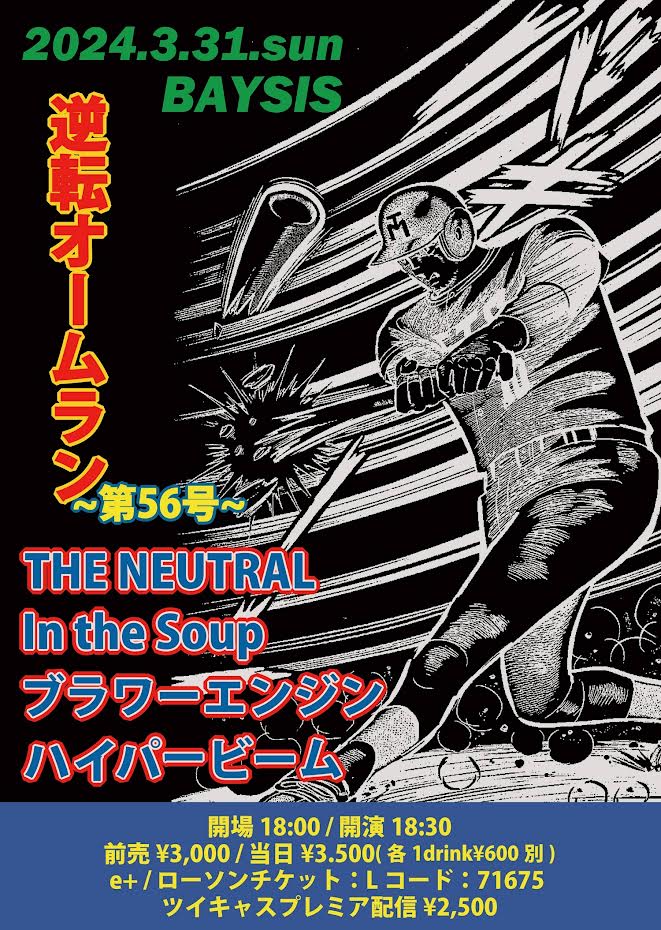 2024年03月31日[日] 「逆転オームラン 〜第56号〜」 会 場: 神奈川 横浜 BAYSIS [HOME] 料 金: 前売 3,000円 (D別600円) / 当日 3.500円 (D別600円) 時 間: Open 18:00 / Start 18:30 チケット:12月16日発売 e+, ローチケ L71675 バンド予約は inthesoup.nakao@gmail.com まで 出 演:THE NEUTRAL, In the Soup, ブラワーエンジン, ハイパービーム 備 考:ツイキャスプレミア配信あります <チケット 2,500円> <試聴ページ> ※ご購入頂いた公演は開演時間になりましたらご視聴可能になります 問い合せ:BAYSIS : 045-227-5528 ![]() ※ → Schedule ジュテーム2023!その前に越谷でもライブ!2023.08.04